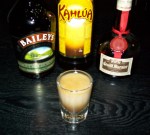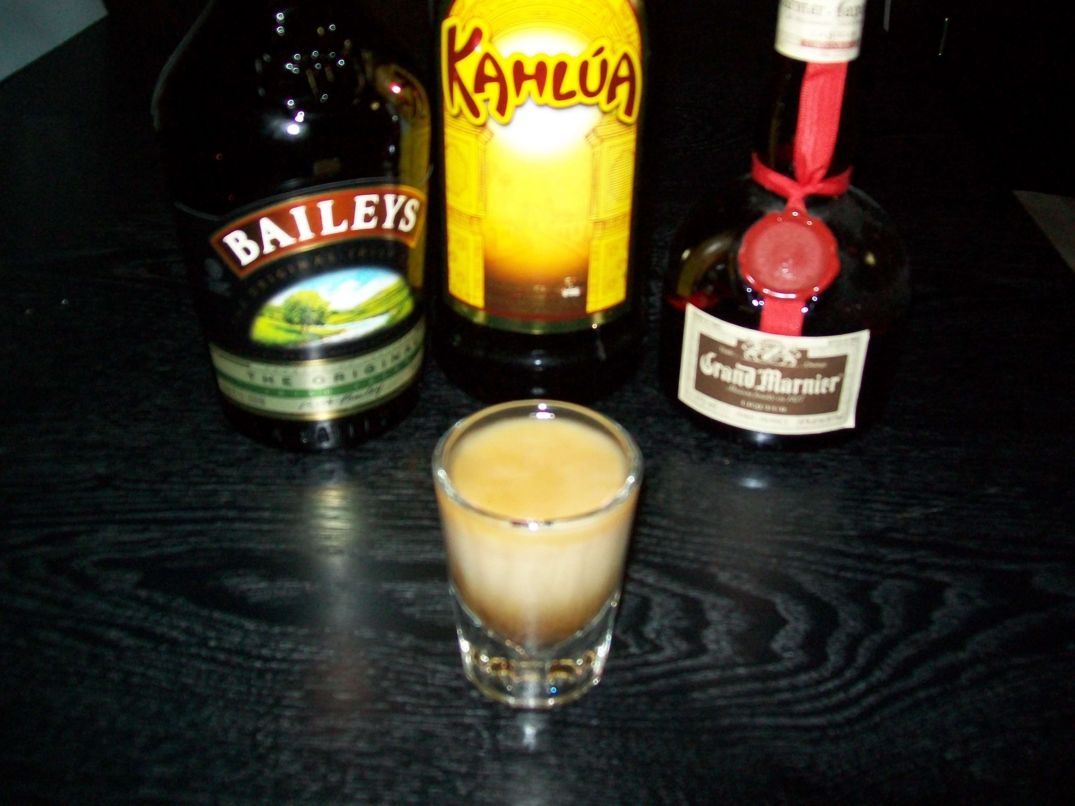 Use equal portions of each liqueur. I recommended 1 ounce of each. First, pour Kahlua in your glass of choice. Gently pour the Bailey’s Irish Creme over the Kahlua. I find using the back of the sppon and pouring to the side of the glass works. Last, pour the Grand Marnier over the Bailey’s.