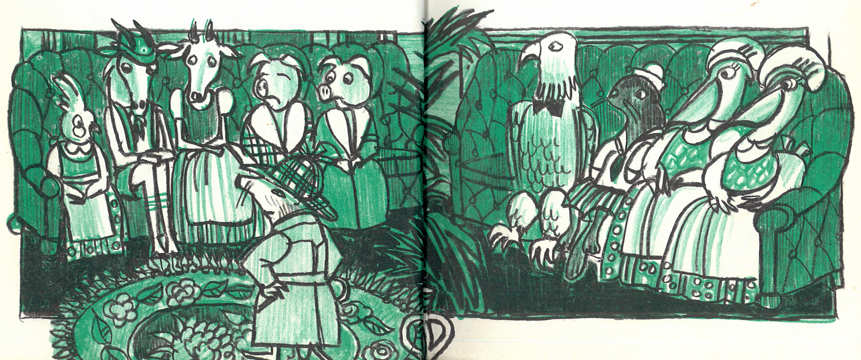 In it, our intrepid sleuth is indeed called in to investigate a string of “occurrences” that are driving customers away from the Tip-Top Inn. Emery Eagle, the Tip-Top’s manager, takes Detective Mole to the inn owned by Mr. & Mrs. Goat. When they arrive, they discover that Mr. & Mrs. Pig, the last paying guests, have been trapped in the elevator. Shortly after someone shuts off the water. Determined to get answers, Detective Mole gathers the suspects. He learns about a break-in at the boat house. Then he hears a story about buried treasure. Someone wants the place to themselves in order to find the legendary treasure of the inn’s first owner.