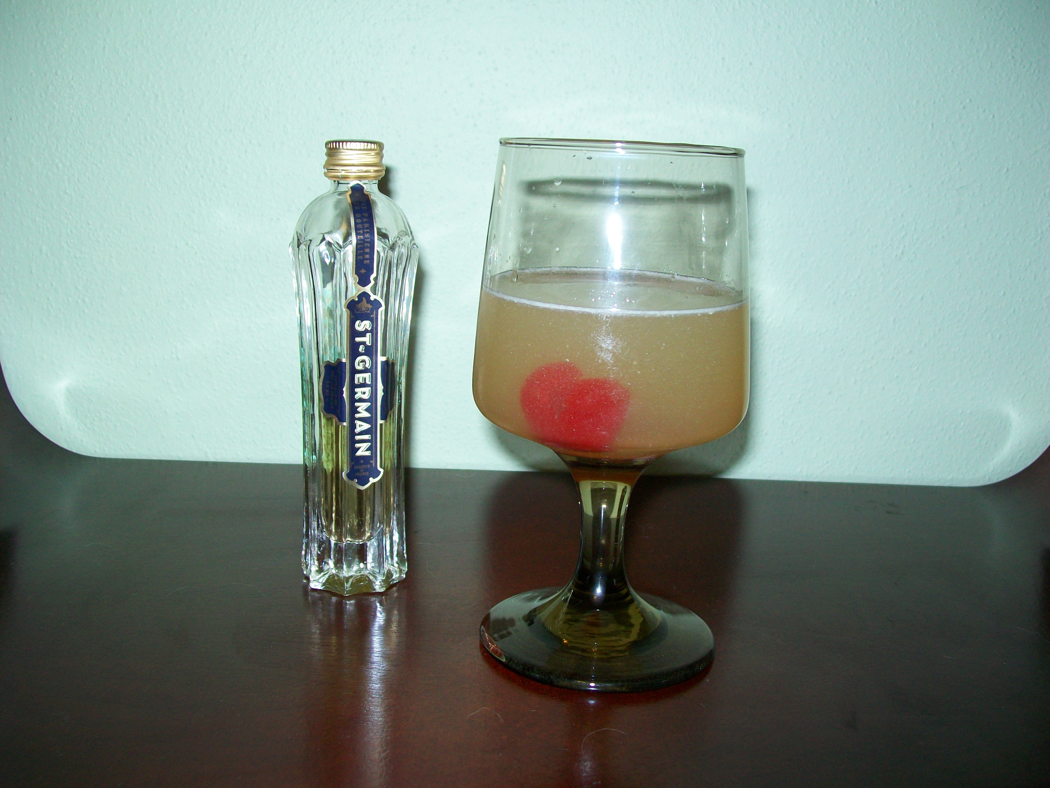 For the simple syrup, put one part sugar to one part water (say a cup of each) in a sauce pan and bring to a boil. Let cool. In a shaker over cracked ice pour in 1 1/2 ounce gin, 3/4 ounce each of St-Germain and lemon juice. Add in 1/2 ounce of simple syrup. Shake vigorously and then strain into a coupe glass. Garnish with a maraschino cherry.