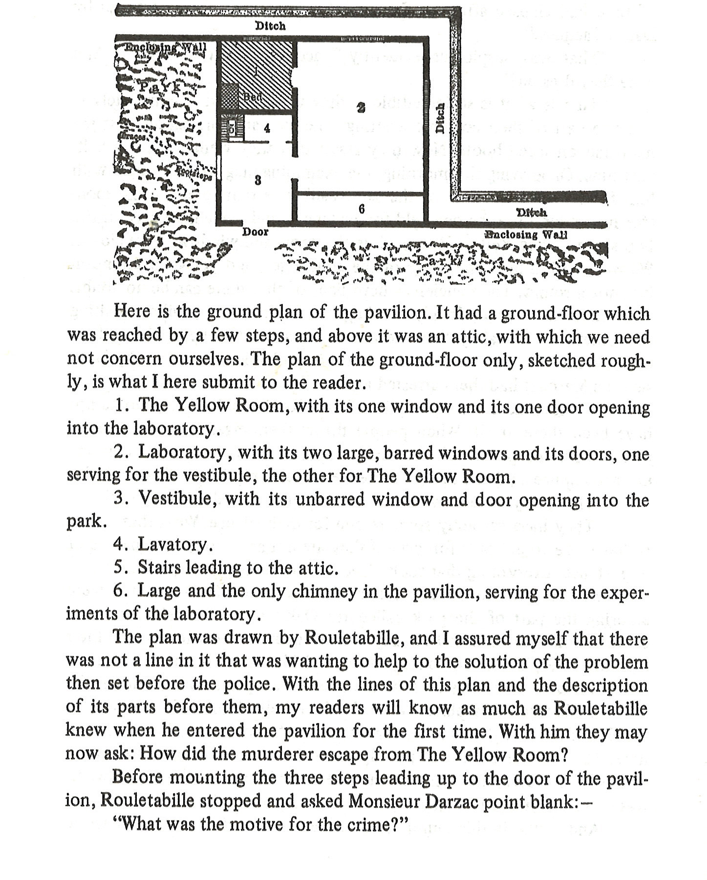 At a secluded estate in the Ile de France, Mademoiselle Mathilde Stangerson retires to the Yellow Room adjacent to her father’s laboratory. Soon after, her father and an elderly servant, Daddy Jaques, hear her cry out. “The Yellow Room has but one barred window — the bars of which have not been moved — and only one door, which had to be broken open — and the assassin was not found!”