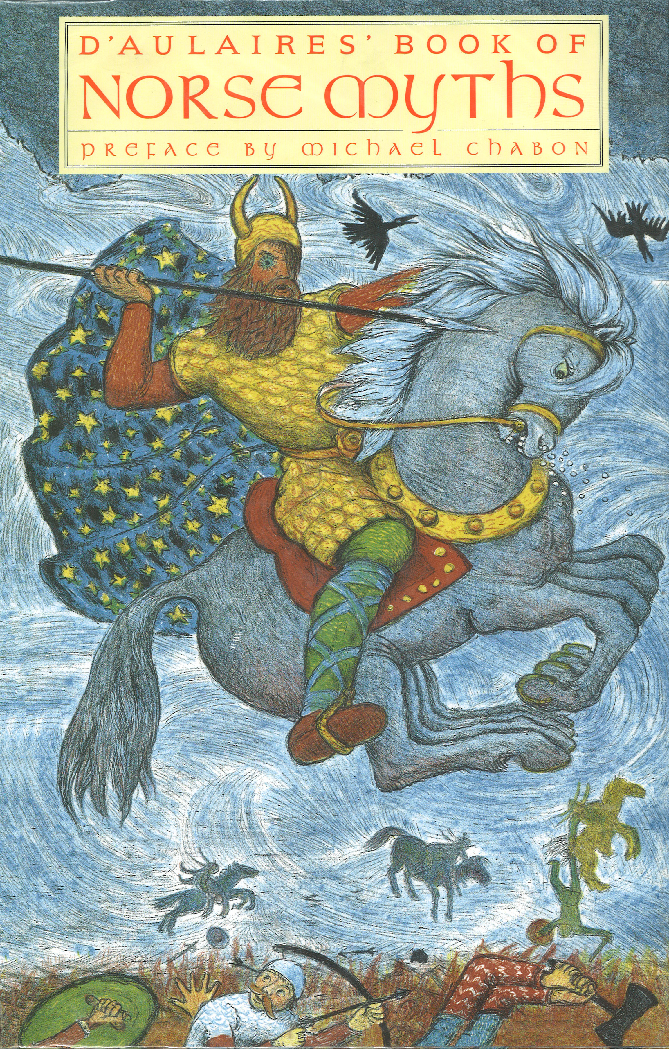 Thus begins the creation myth in the D’Aularies’ Book of Norse Mythology. The husband and wife team, Ingri & Edgar Parin d’Aulaire, followed up their successful D’Aulaires’ Book of Greek Mythology, pubilshed in 1961, with this volume of mythology from the Northern climes in 1967. This picture book is an excellent and accessible presentation of thirty Norse myths. As with their previous volume, each myth is narrated in storybook fashion along with memorable illustrations.