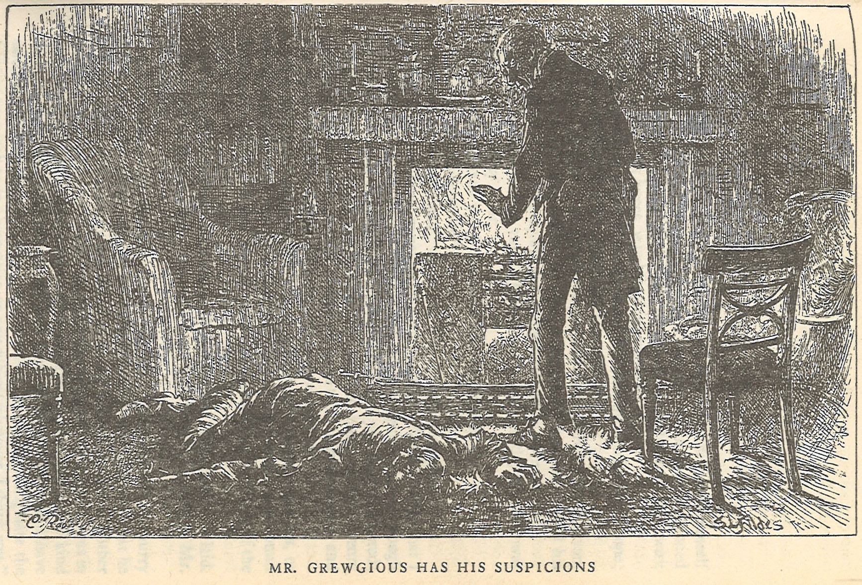 Soon after, Mr. Grewgious pays a visit to Jasper. Jasper asks after Rosa and, surprisingly, if Mr. Grewgious has seen the “suspected young man’s sister.” Grewgious confirms that he has, and than Miss Landless is defiant in the belief of her brother’s innocence. Then Grewgious tells Jasper of Rosa and Drood’s decision to dissolve their engagement. He “saw a ghastly figure rise, open-mouthed, from the easy chair, and lift its outstretched hands toward its head.” This figure, Jasper, then shrieks and crumples in a heap to the floor.