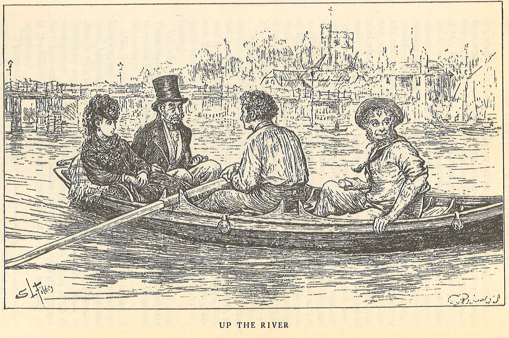 The chapter shifts to Grewgious’ search for suitable lodgings for Rosa and Miss Grewgious, who will be invited up to London to look after her. Thus, a new character is introduced: Mrs. Billickin is a cousin of Bazzard’s. Grewgious’ banter with Mrs. Billickin allows for much needed humor at this point in the story, which has taken a dark and serious turn since the meeting between Jasper and Rosa in Chapter Nineteen. Mrs. Billickin, a true Dickensian character!, provides further comic relief when Miss Twinkleton arrives. The two women do not get along.Little else happens in this chapter but for a brief aside in which Tartar takes Rosa and Grewgious on a river excursion. See the above illustration with (from left to right) Rosa, Grewgious, Tartar, and Mr. Tartar’s man, Lobley, who had charge of the boat.”As the days crept on and nothing happened, the neighbours began to say that the pretty girl at Billickin’s, who looked so wistfully and so much out of the gritty windows of the drawing-room, seemed to be losing her spirits. The pretty girl might have lost them but for the accident of lighting on some books of voyages and sea-adventure.”More than anything these two chapters, considered to be the halfway mark of the unfinished whole, seem to be setting up for a happy ending, at least for Rosa. The object of Jasper’s obsession and Drood’s former fiancee is finally shown, in these latest chapters, as a more central character in her own right. Is her new found love of sea adventures a sign of her future to come? What of Jasper’s machinations? And who is Datchery?