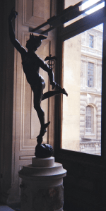 Such words could describe this bronze statue of Mercury, the Roman version of the Greek god of travelers and thieves, merchants and shepherds, and the messenger of the gods, Hermes. Born at night, Hermes famously snuck out of his home—and from his mother’s watchful eye—to steal the cattle of his brother, the sun god Apollo. So the placement of this figure is rather fitting.